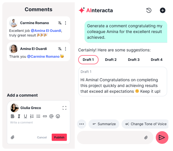 Use AI to send personalized communications to people or groups, reducing information chaos. And if you are concerned about the content you are posting, ask AInteracta to shorten, expand or change the tone of voice of your messages.