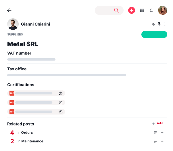 As with employees, you can create dedicated files for suppliers, where you can find: general information, active contracts, interventions, and any links to processes.
