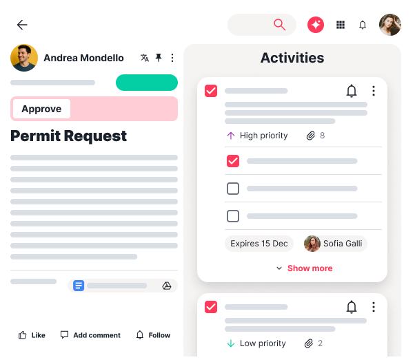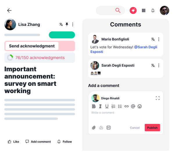 The platform offers you digital spaces for every type of communication: from official announcements requiring reading confirmation to surveys to gather feedback, to campaigns to engage the company workforce and spread culture. With Interacta, every communication becomes an opportunity to inform, listen, and foster participation.