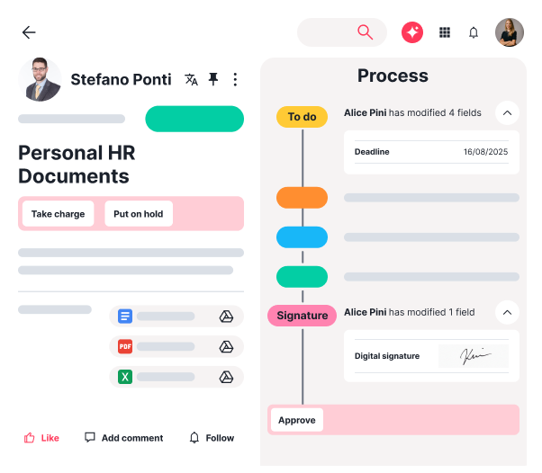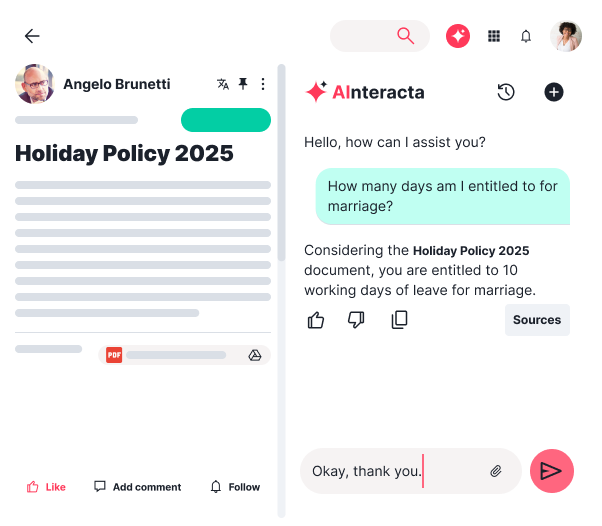 Every day, the HR team receives questions and inquiries. With Interacta, the company knowledge base is always accessible and can be queried using a simple and intuitive Q&A interface. No more endless searches or repetitive requests: with AI, answers arrive in natural language, directly in posts or attachments.