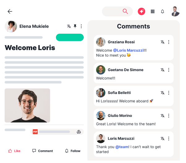 Interacta promotes continuous engagement and effective communication: thanks to features such as comments, reactions, polls, and dedicated spaces, you can always welcome or greet a colleague, respond to questions and concerns, provide real-time support, and gather feedback to improve the process.