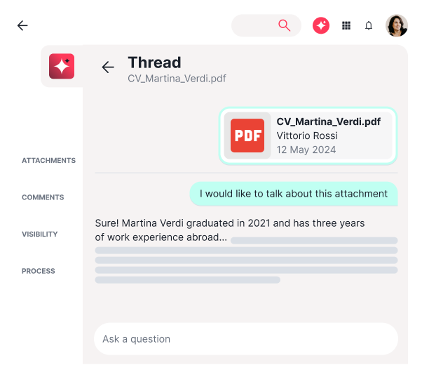 Use the power of Artificial Intelligence to review CVs, cover letters, and portfolios during the scouting phase. You can also interact with Interacta's AI to get quick answers about onboarding and offboarding flows for constant improvements and revisions.