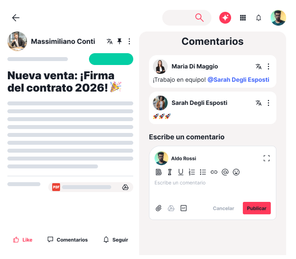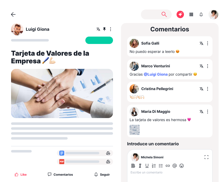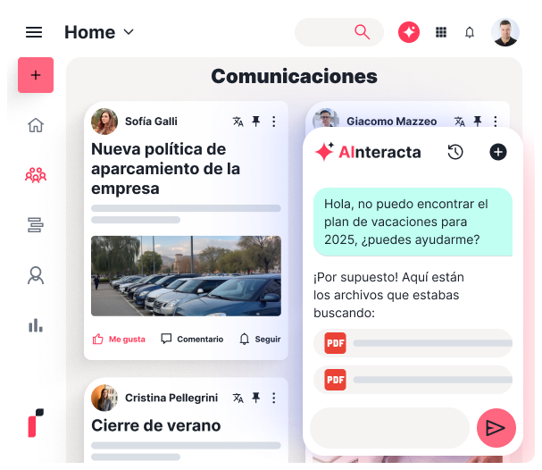 Promover una cultura de reconocimiento en la empresa aumenta la motivación y el compromiso. Las comunidades de Interacta son el lugar ideal para celebrar hitos y compartir éxitos, tanto grandes como pequeños. También son un excelente lugar para recibir retroalimentación y participar en debates constructivos. Las funciones sociales de la plataforma (publicaciones, comentarios, reacciones y encuestas) crean un entorno dinámico y compartido donde el trabajo se vive de forma positiva.