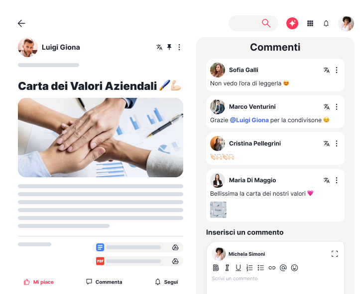 Le funzionalità social della piattaforma – post, commenti, reazioni e sondaggi, creano un ambiente dinamico e condiviso dove vivere il lavoro positivamente.