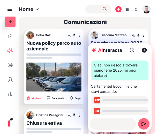 Promuovere una cultura del riconoscimento in azienda, aumenta la motivazione e il coinvolgimento delle persone. Le community di Interacta sono il luogo giusto per celebrare traguardi e condividere piccoli e grandi successi. Ma anche per ricevere feedback e partecipare a dibattiti costruttivi.