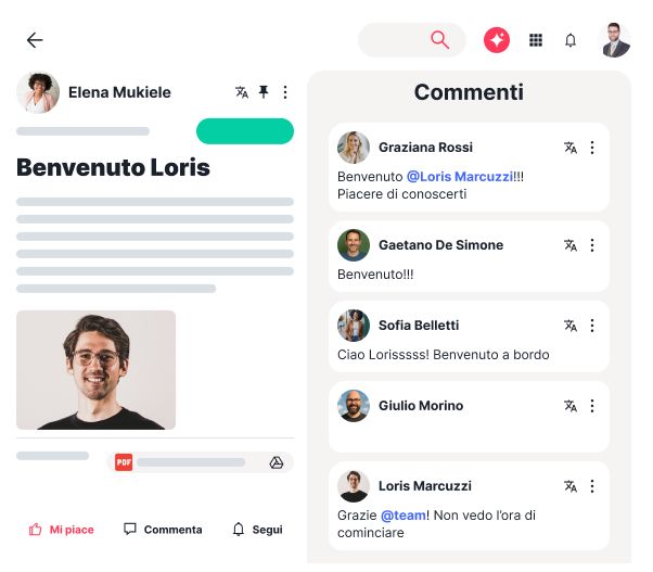 Interacta promuove un coinvolgimento continuo e una comunicazione efficace: grazie a funzionalità come commenti, reazioni, sondaggi e spazi dedicati, è sempre possibile dare il benvenuto o salutare un collega, rispondere a dubbi e domande, fornire supporto in tempo reale e raccogliere feedback per migliorare il processo.