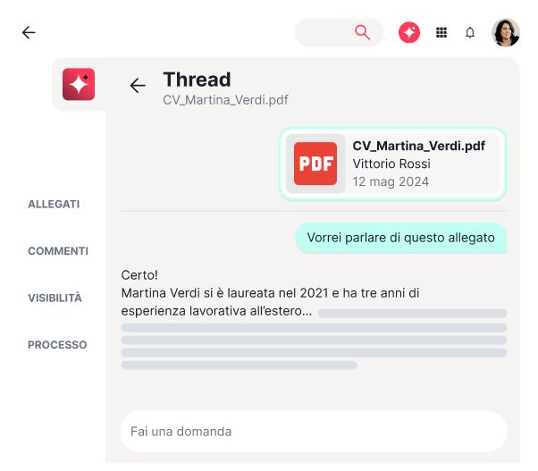 Usa la potenza dell’Intelligenza Artificiale per interrogare CV, cover letter e portfolio in fase di scouting. Inoltre, puoi dialogare con l’AI di Interacta per ottenere risposte veloci in merito ai flussi di Onboarding & Offboarding per miglioramenti e revisioni costanti.